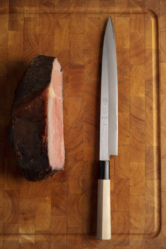 Yanagi (also called yanagiba or shobu) is the quintessential sashimi knife. It’s long and thin blade is suited for slicing delicate fish in a single stroke. May also be used for portioning other raw, boneless meats.