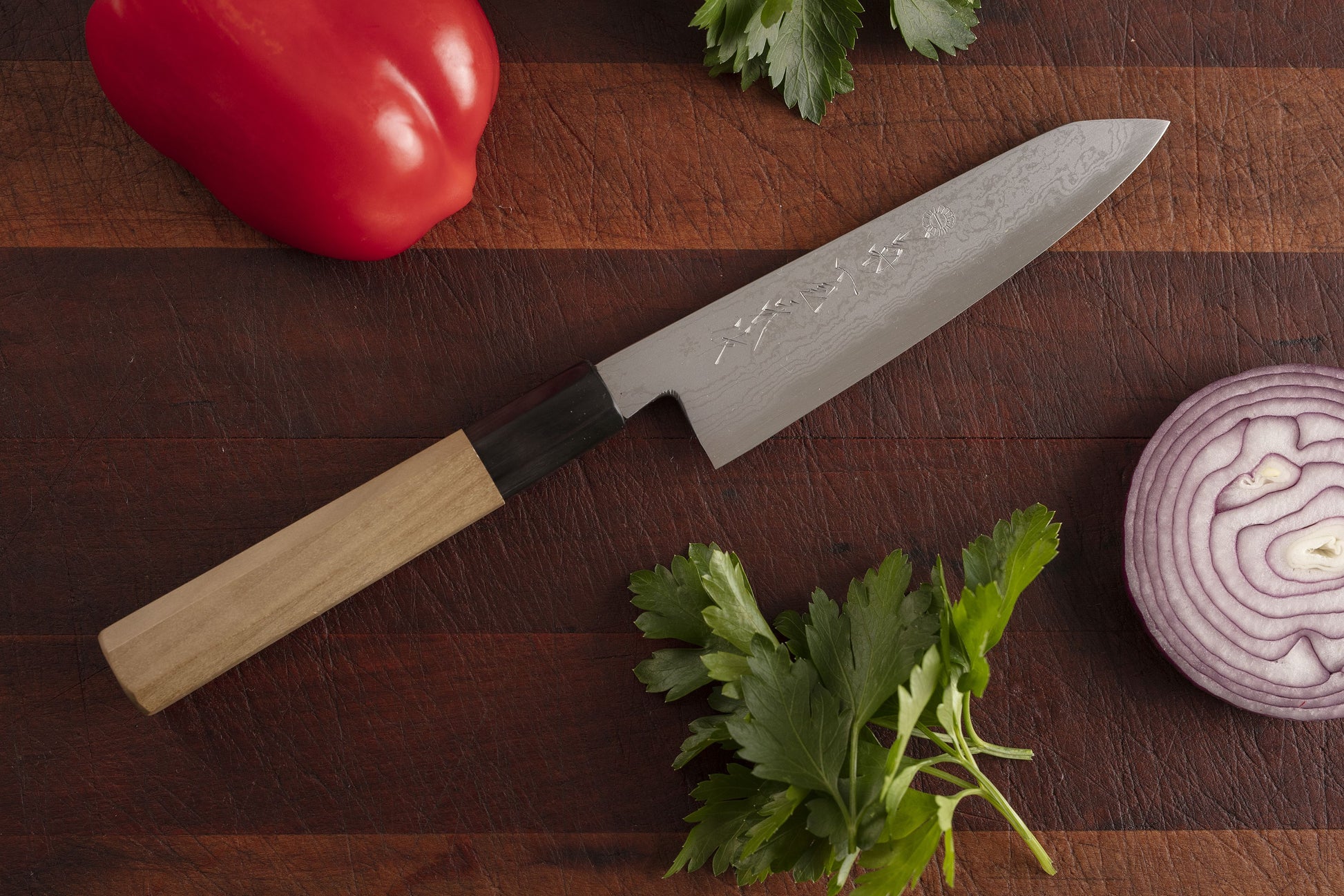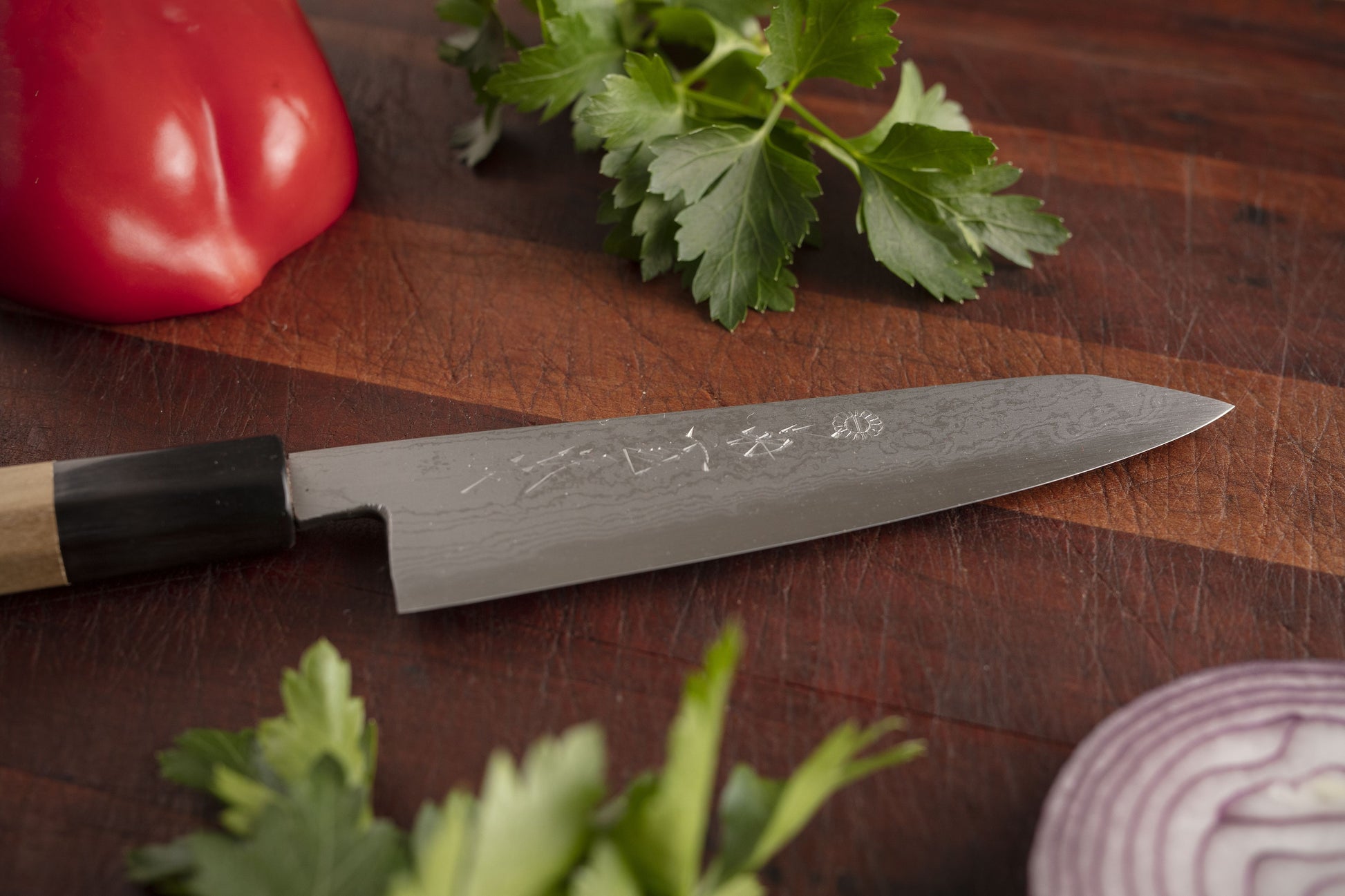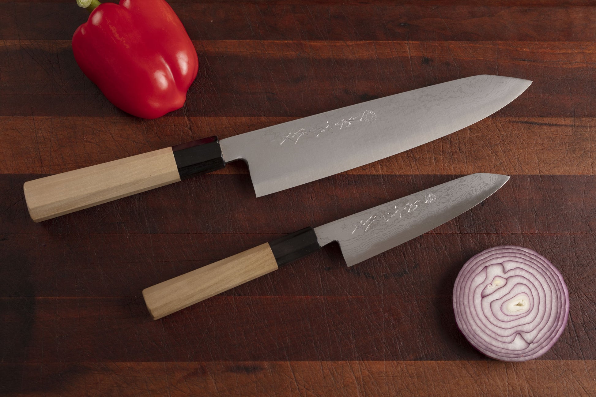 Superior double beveled knives from the famed Kokajikai knife makers in Sakai. These are true hand forged 9-layer Damascus Aoko Blue carbon steel knives. The double beveled blades have fantastic geometry and edge holding.