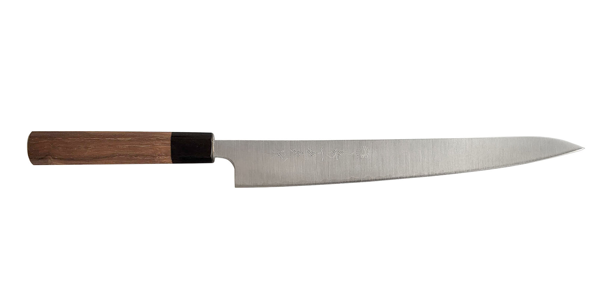The GW Series is a perfect example of the Japanese design philosophy shibui, a balance of simplicity and complexity. While the GW series is not adorned with decorative elements such as hand-hammered tsuchime or a Damascus finish, a simple elegance creates a powerful appearance. The 3-layer blade with a Ginsan (silver-3) core is thin, strong, and precise; and the octagonal walnut handle provides a comfortable grip.