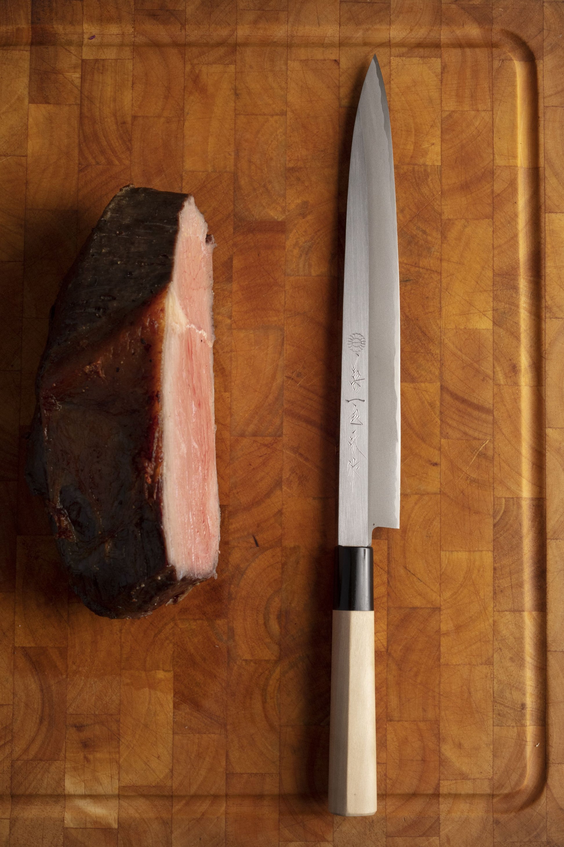 Kasumitogi is another single bevel traditional series hand forged in the sword making tradition from two pieces of steel. The slightly softer white #3 carbon steel edge is easier to sharpen and more forgiving for chefs who have not completely mastered their sharpening technique.
