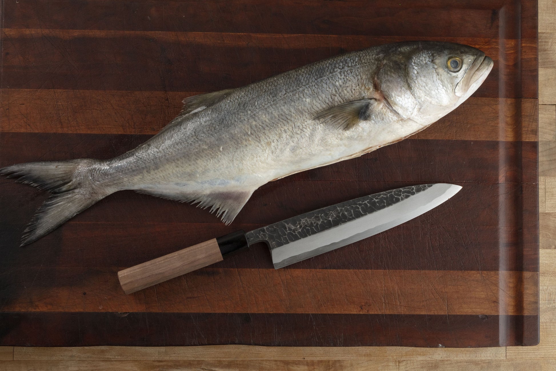Brand new for 2022! Our Kurouchi Kasumi Tsuchime single bevel traditional series hand forged in the sword making tradition from two pieces of steel. The White #2 carbon steel edge is an excellent choice for both toughness and a fine edge for exact slices. The White #2 Carbon edge with soft black iron cladding provides a distinctive look as the final layer of iron has an oxide coating to help prevent rust.