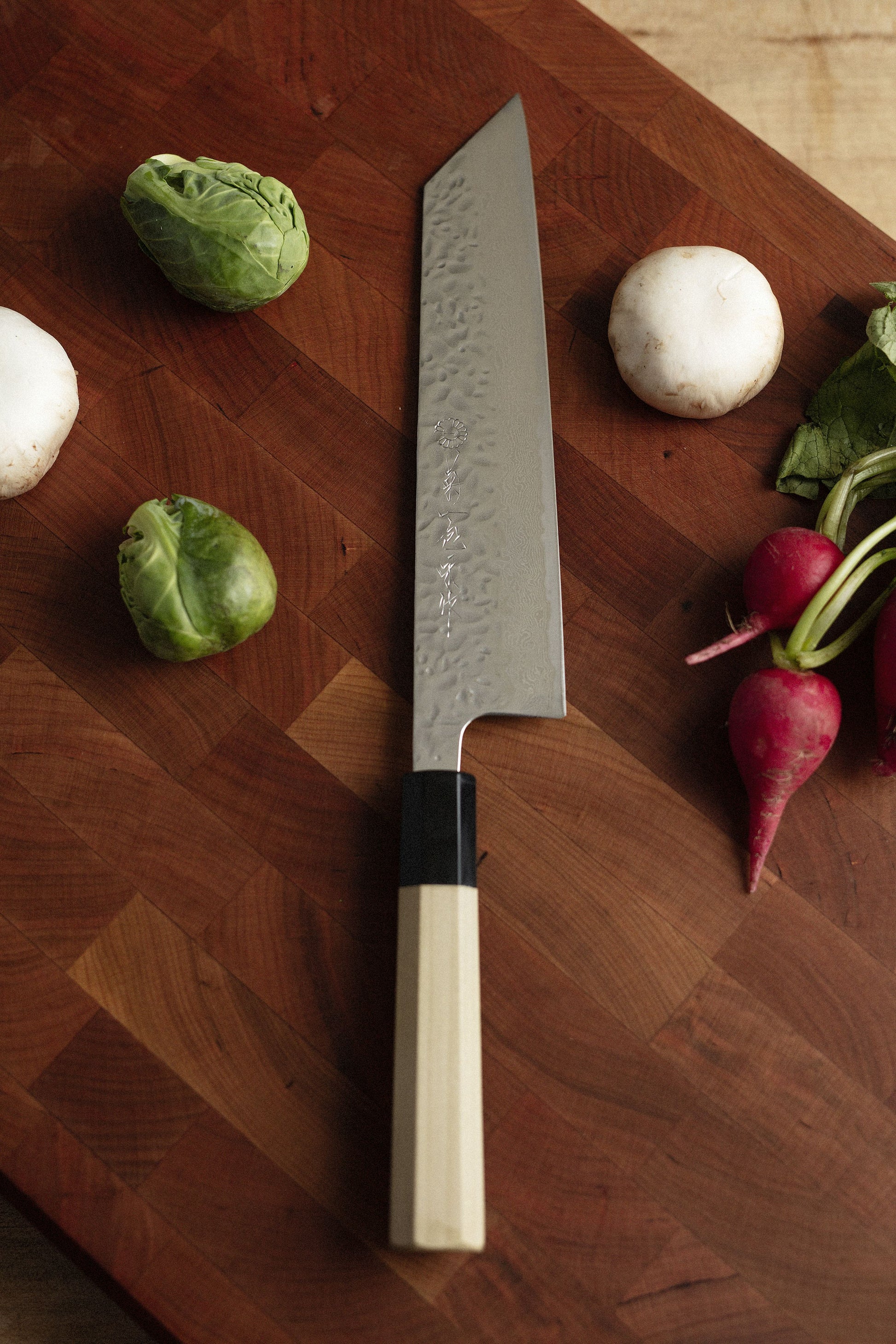 67-Layer Mirror finish Damascus Tsuchime line. These are some of the finest blades we have ever made at Kikuichi. With a 67-layer, hammered mirror finish they sparkle on the wall and in the hand. The lighter than average blades make your cooking prep an absolute pleasure. The Octagonal Ho-wood Magnolia handle is made by traditional handle craftsmen and recalls the old style with its water buffalo ferrule, while the AUS10 core steel is a modern material made to withstand even the longest mise en place.