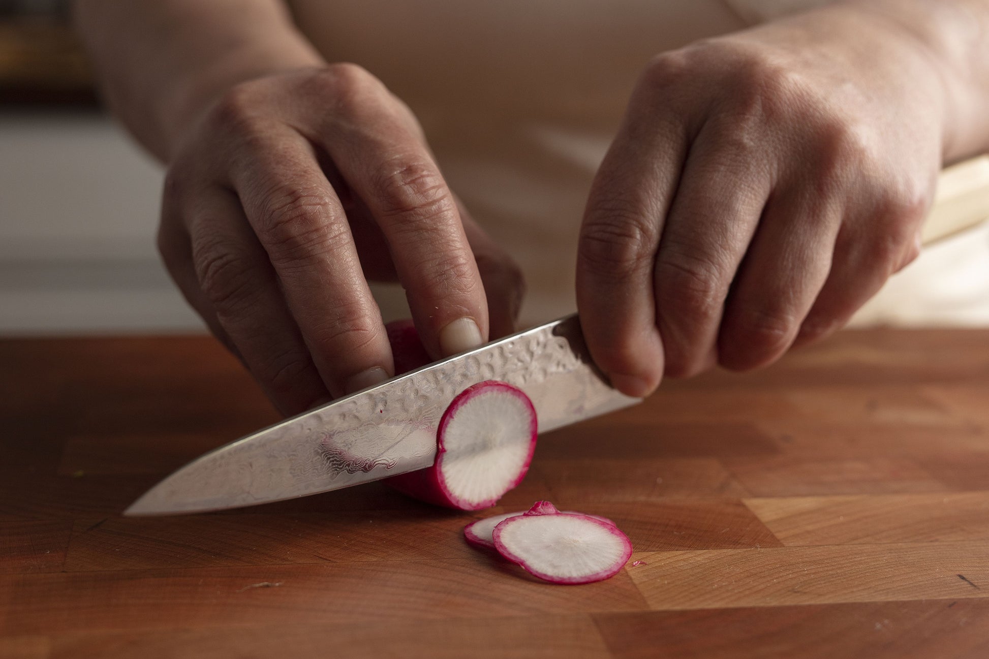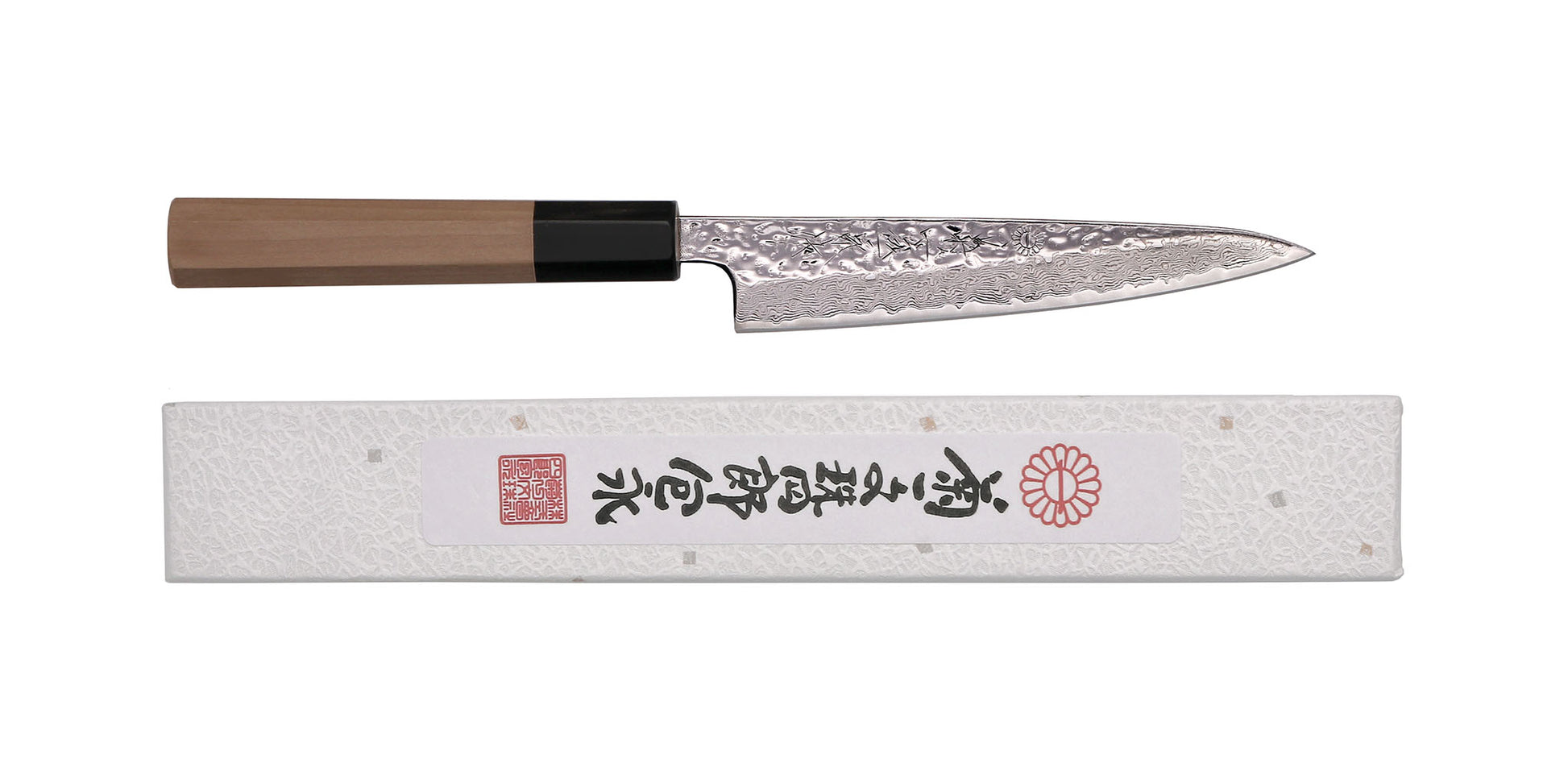 67-Layer Mirror finish Damascus Tsuchime line. These are some of the finest blades we have ever made at Kikuichi. With a 67-layer, hammered mirror finish they sparkle on the wall and in the hand. The lighter than average blades make your cooking prep an absolute pleasure. The Octagonal Ho-wood Magnolia handle is made by traditional handle craftsmen and recalls the old style with its water buffalo ferrule, while the AUS10 core steel is a modern material made to withstand even the longest mise en place.