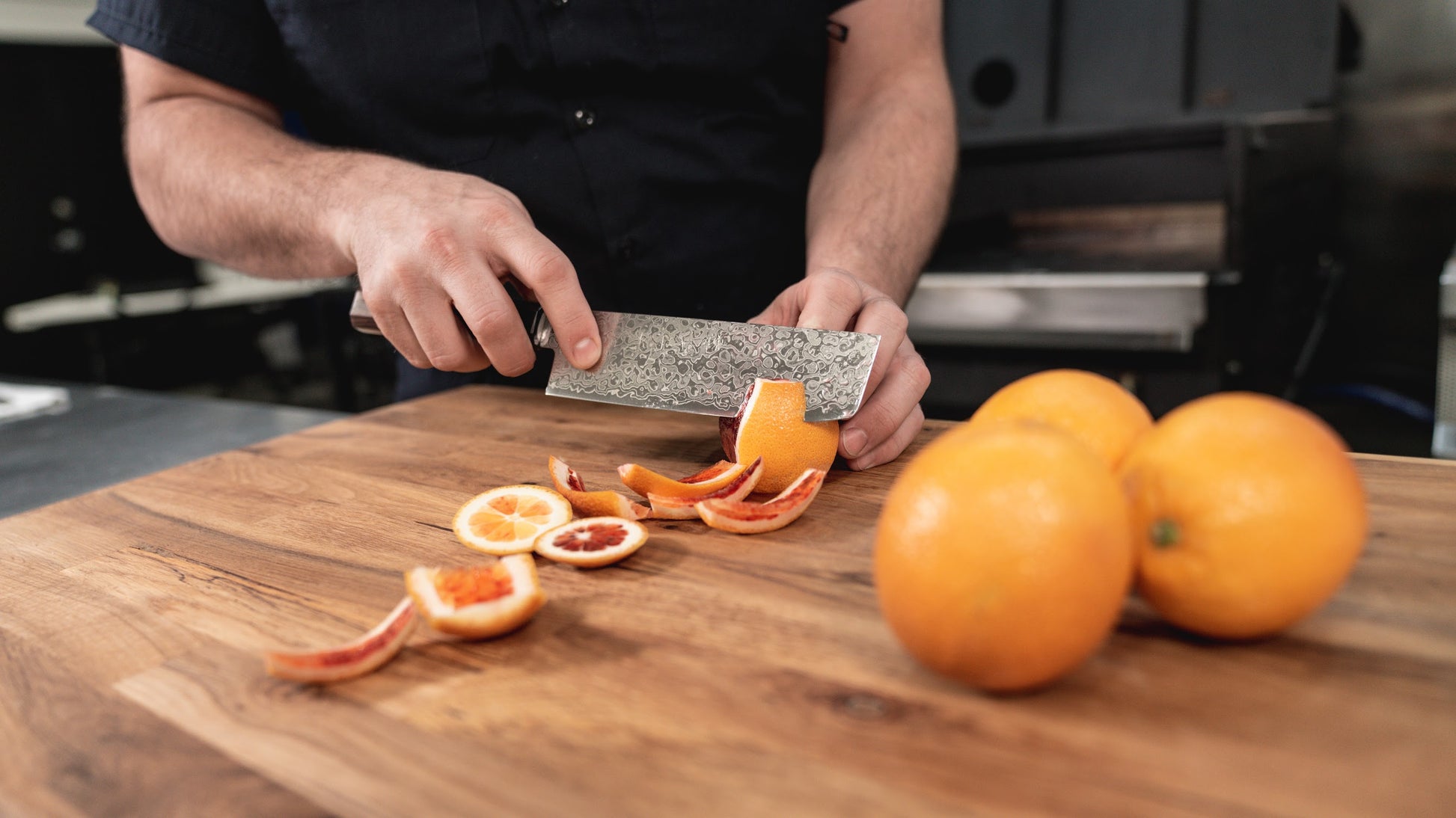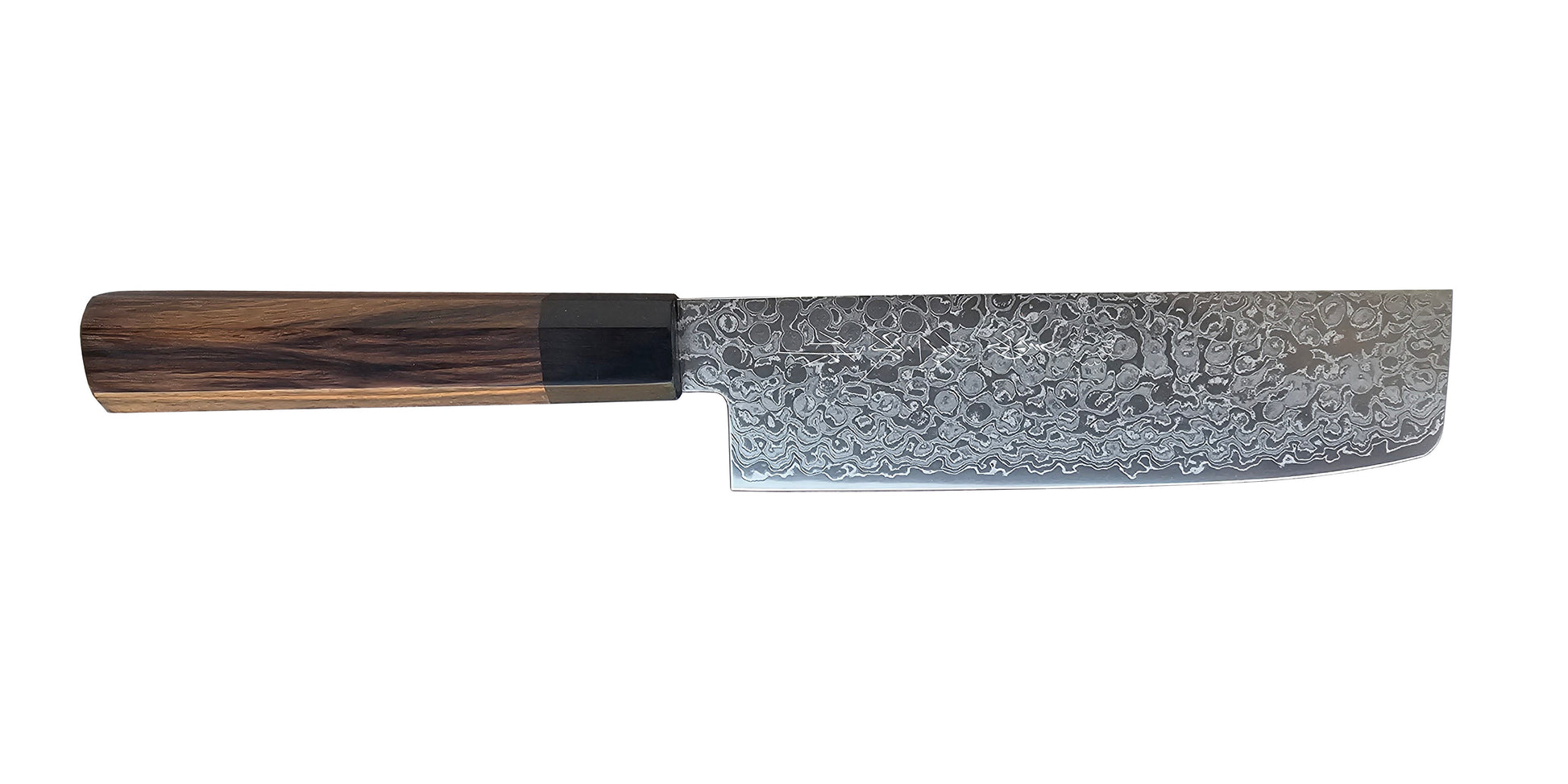 Our Nickel Warikomi Damascus series may be the most nimble knives you ever hold. This thin and agile 45 layer Damascus blade has a edge of AUS10, one of the finest modern Japanese blades available. Matched with a Rosewood handle, this series is beautiful and functional, and destined to be the showpiece of any kitchen.
